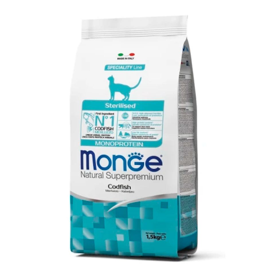 Сухой корм MONGE CAT Sensitive Sterilised для стерилизованных кошек с треской. Monge Cat Monoprotein Sterilised Merluzzo - корм с одним источником животного белка.