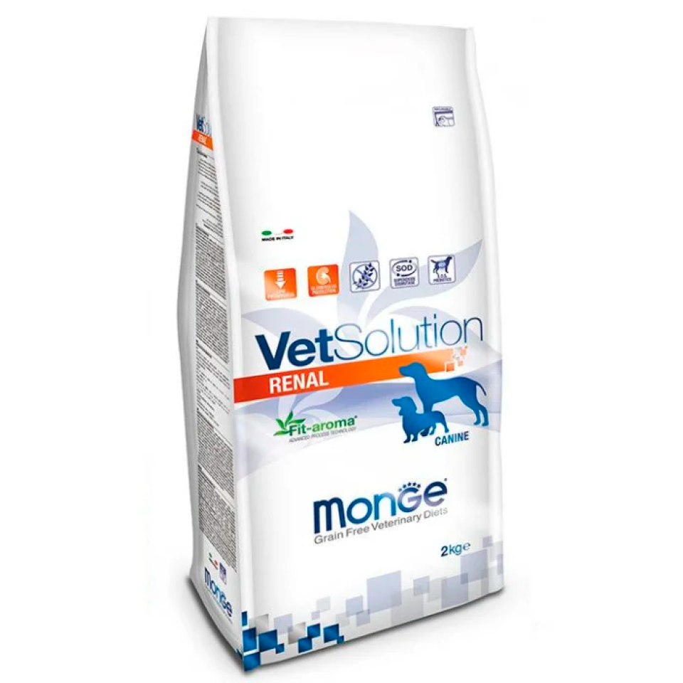 Monge VetSolution Renal — полнорационный сухой диетический корм из курицы для собак « Renal» для поддержания функции почек у собак при острой или хронической почечной недостаточности. Содержит концентрат сока дыни для нейтрализации свободных радикалов. Fit-aroma: зеленый чай для поддержки почек, ксилоолигосахариды для кишечной микробиоты. Формулу отличает пониженный уровень высококачественного белка, сниженное содержание фосфора и сырого белка, низкие уровни кальция, витамина D.